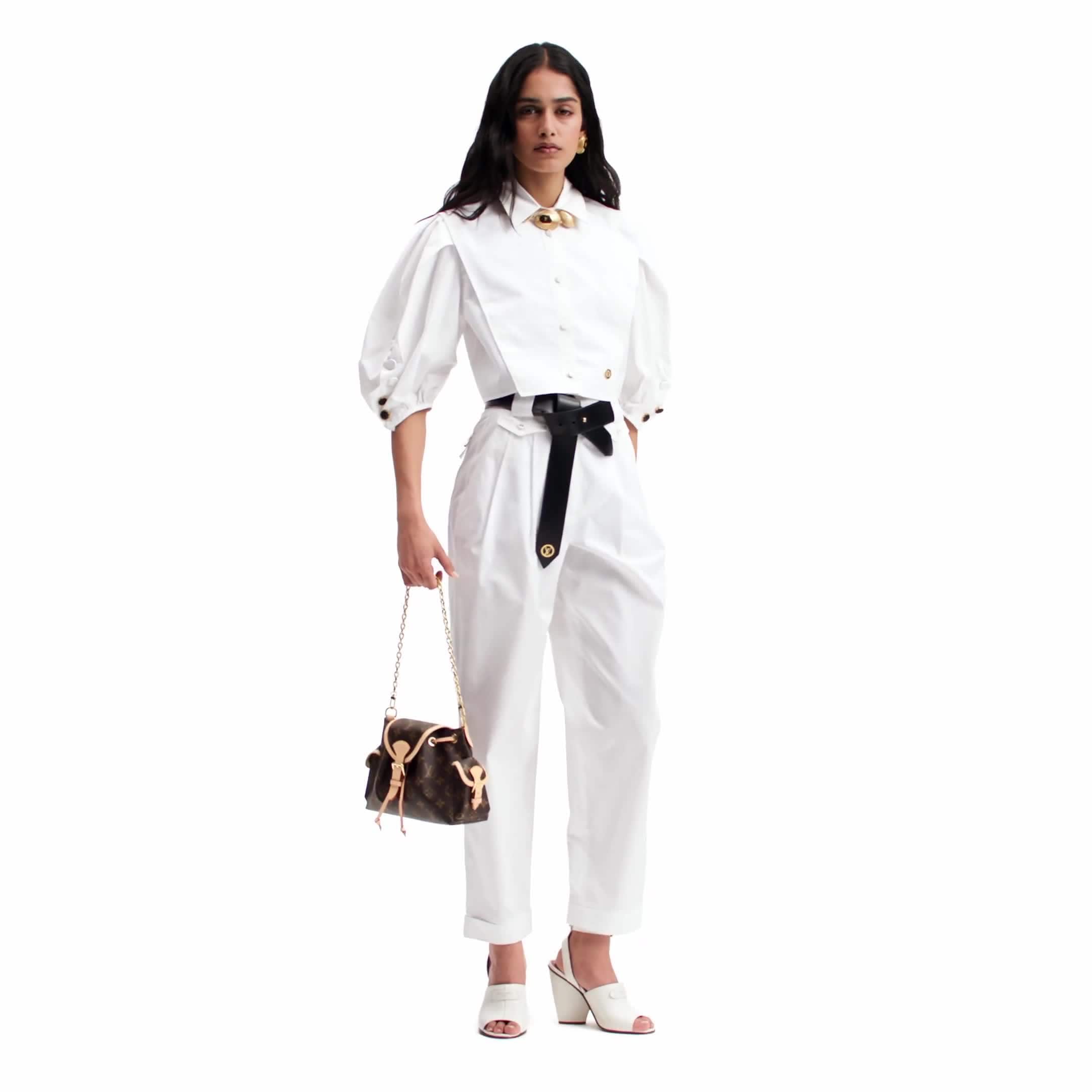 Taillé dans de la popeline de coton, ce pantalon au charme estival présente des jambes amples volumineuses mises en valeur par des plis au niveau des hanches. Une taille haute large dessine une silhouette flatteuse tandis que deux petites poches à rabats structurent la pièce. Les boutons brodés aux contours dorés de la saison prêtent un surcroît d'élégance à ce modèle.