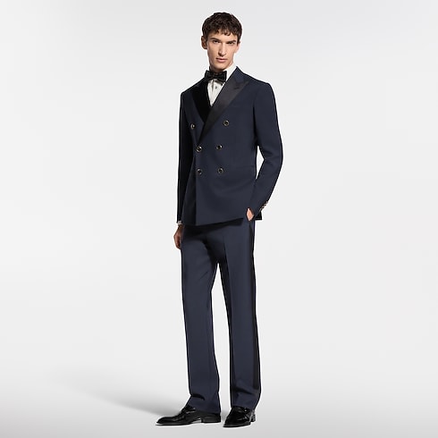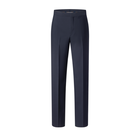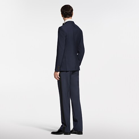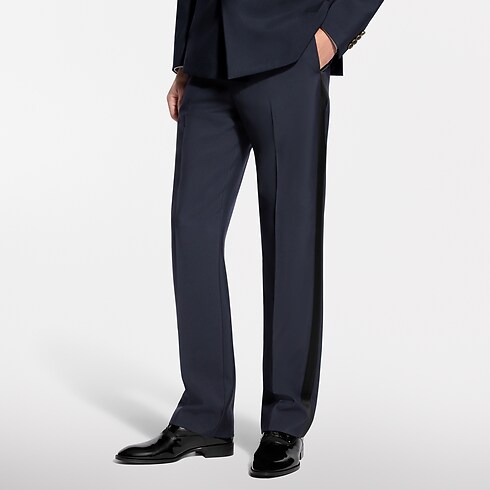 Ce pantalon de smoking présente une coupe classique. Confectionné en laine grain de poudre bleu marine élégante, il est orné de bandes en satin noir sur l’extérieur de chaque jambe et doté de poches arrière passepoilées en satin. Une étiquette LV tissée appose discrètement la signature de la Maison à l’arrière de la taille. Il peut se porter avec la veste croisée assortie pour composer un ensemble de soirée habillé et intemporel.