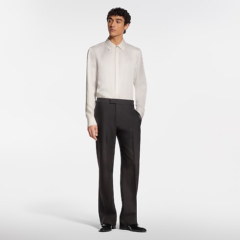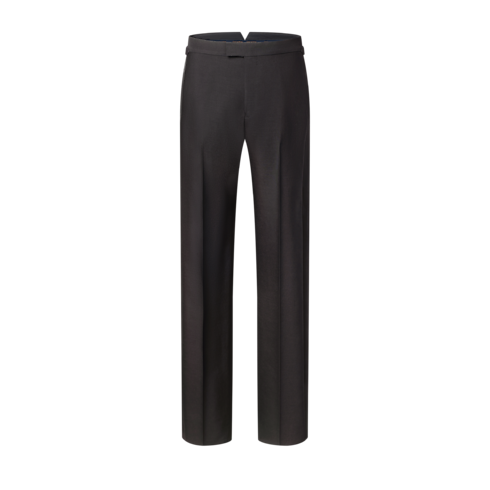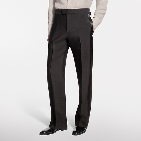D’une élégance impeccable, ce pantalon de smoking noir se compose de crêpe de laine et de soie drapé, orné de bandes en satin à l’extérieur de chaque jambe. Une ceinture ajustable assure une silhouette raffinée, tandis que des rivets fleur de Monogram apposent une signature discrète sur les languettes. Une veste de smoking et une chemise assorties complètent cet ensemble de soirée chic.