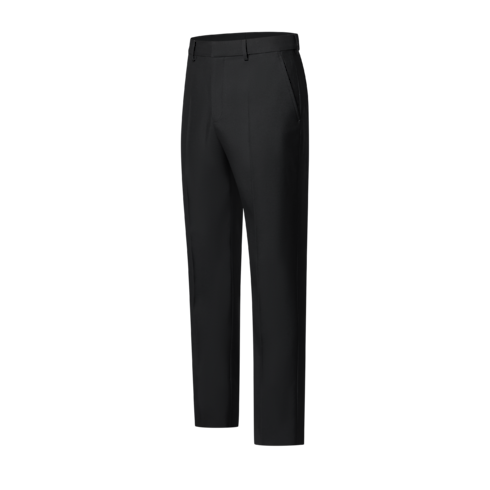 Réalisé en laine de costume fine selon une silhouette slim, ce pantalon de soirée noir rehausse les tenues formelles d'une note structurée. Une étiquette « Marque L. Vuitton Déposée » tissée en ton sur ton sublime l'arrière de la taille de cet indispensable intemporel du dressing masculin. Il peut se porter avec d'autres pièces habillées pour adopter l'approche dépareillée des costumes de la collection.