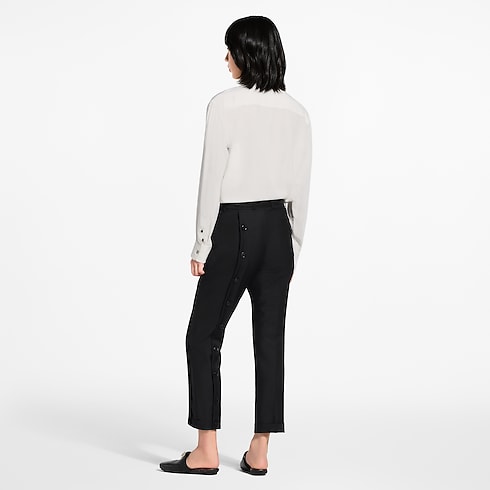 Ce pantalon revisite le tailoring classique avec une approche plus ludique. Confectionné dans un mélange structuré de laine et de mohair, il présente une coupe droite ponctuée de plis marqués à la finition impeccable. La jambe gauche est soulignée de boutons fonctionnels ton sur ton sur toute la longueur, à l’avant comme à l’arrière, offrant des possibilités de style modulables et contemporaines.