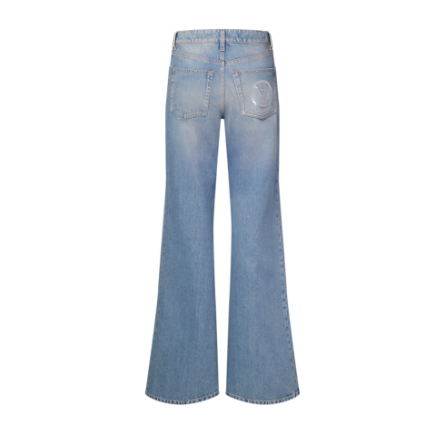 Confectionné en denim bleu délavé, ce jean présente une coupe évasée rehaussée de surpiqûres jaunes contrastées qui créent un look structuré. Des éléments LV Circle miniatures ornés de sequins apportent une note scintillante et emblématique de la Maison au niveau des poches oversize à l'esprit utilitaire. L'ensemble est complété par des signatures oversize sur la poche arrière droite.