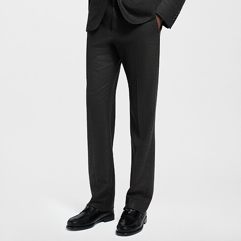 Ce pantalon gris foncé raffiné présente la nouvelle coupe Gaston à la fois droite et flatteuse. Il est confectionné dans un mélange somptueux de cachemire et de laine vierge et orné d'une étiquette tissée « Marque L. Vuitton Déposée » au dos de la ceinture. Porté avec la veste assortie, il compose un costume intemporel à l’élégance affirmée.
