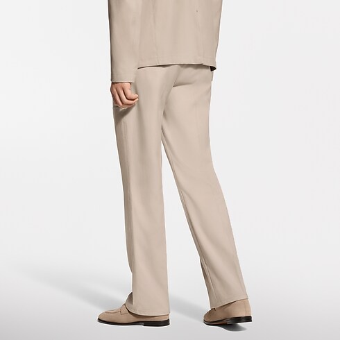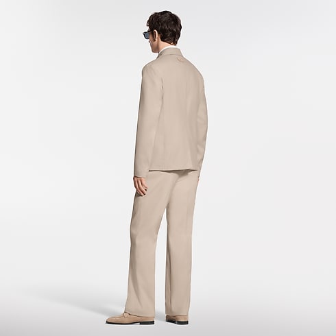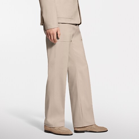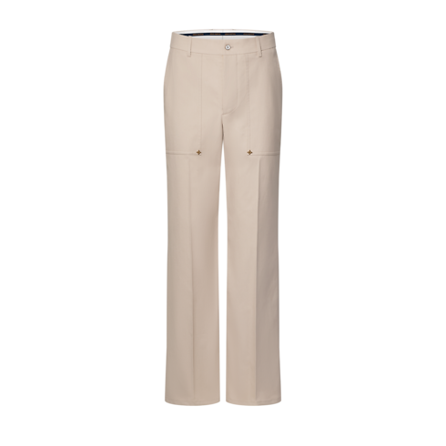Ce pantalon beige élégant inspiré du workwear présente une coupe habillée. Confectionné dans un mélange de coton biologique et de soie, il allie respirabilité et éclat subtil. Les deux grandes poches plaquées à l'avant sont ornées de rivets fleur de Monogram dorés, tandis qu’une étiquette LV tissée signe l'arrière de la taille. Une veste assortie permet de composer un ensemble actuel, idéal pour le printemps.