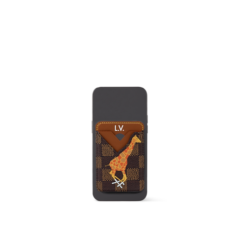 Confectionné en toile Damier Heritage et en cuir marron clair, ce porte-cartes aimanté est orné d’un motif de girafe qui court, en hommage au film The Darjeeling Limited. Il s'attache sur les iPhone dotés de la technologie MagSafe et présente deux fentes en forme de V pour les cartes.