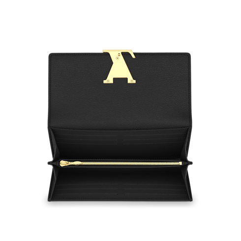 Pour la saison Printemps-Été 2019, Louis Vuitton revisite ce portefeuille Capucines classique et le décline dans un cuir d’alligator mat et précieux. La teinte marron taupe met en valeur la fermeture LV gainée de cuir de ce modèle à rabat élégant et raffiné.