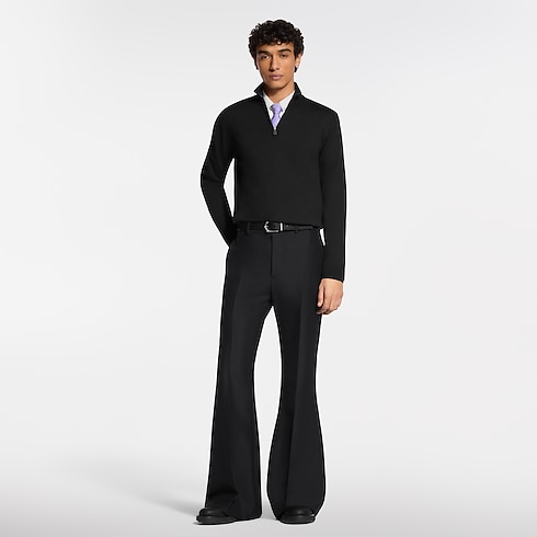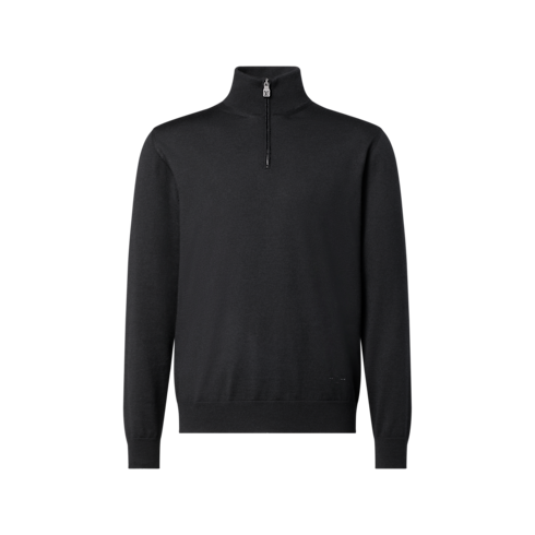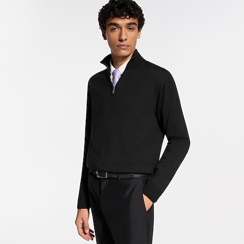 Ce pull chic demi-zippé noir est confectionné dans un mélange somptueux de laine, de soie et de cachemire, qui offre un toucher particulièrement doux et un confort optimal. La maille fine à l’esprit estival est rehaussée d’une broderie signature sur l’ourlet à gauche et d’un patch LV en cuir au dos. Cette pièce intemporelle se porte fermée, à la manière d’un col roulé, ou ouverte sur une chemise.