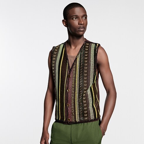 Issu du défilé Printemps-Été 2026, ce pull sans manches somptueusement ornementé s’inspire des traditions artisanales indiennes ancestrales. La base en maille de laine est brodée de perles de verre étincelantes qui dessinent un motif rayé, où se distinguent des colonnes discrètes de signatures LV dans des tons de marron et de vert. Ce modèle à la décontraction sophistiquée insuffle un esprit dandy actuel à un look.