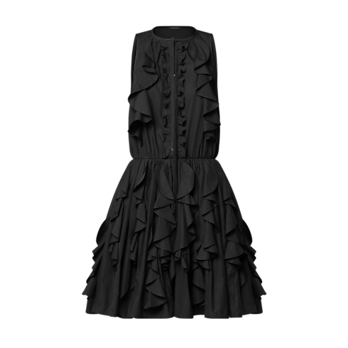 Cette petite robe noire à l'esprit actuel est confectionnée en popeline de coton légère et rehaussée de volants raffinés au niveau de la poitrine et autour de la jupe volumineuse. Elle présente une lavallière qui apporte une finition romantique à l'avant, ainsi qu’une taille cintrée qui souligne la silhouette. L'ensemble est complété par une fermeture éclair invisible sur le côté.