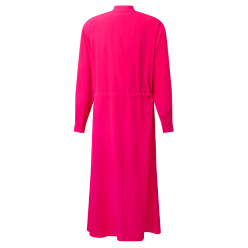 Lumineuse et ultralégère, cette robe longue en crêpe de Chine en soie se décline dans une teinte remarquable de la saison. Sa coupe à manches longues est dotée d'une ceinture élastique à cordon qui souligne la silhouette. L'ensemble est complété par un col montant et des poches latérales à boutons-pression dorés à l'esprit sportif, ainsi que par une fermeture éclair apparente.