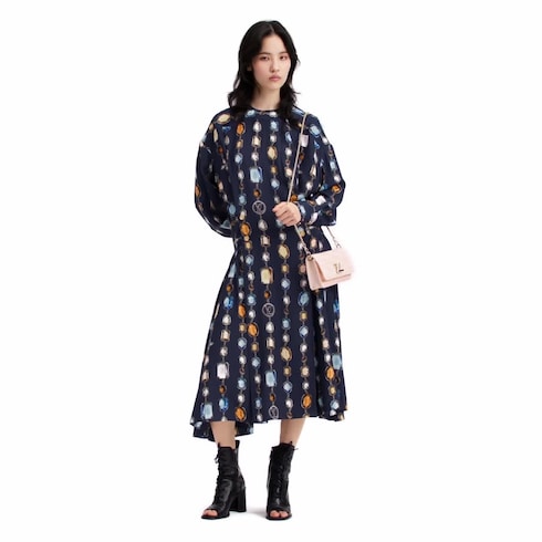 Cette robe sophistiquée se pare d'une version oversize du motif collier de la saison qui réinterprète des détails emblématiques de la Maison avec des pierres précieuses. Confectionnée en crêpe de Chine en soie fluide, elle présente une silhouette élégante à manches longues agrémentée d'une taille définie et d'une jupe mi-longue légère. Des boutons martelés dorés subliment les poignets.