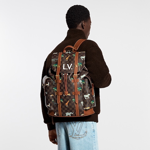 Issu de la collection The Darjeeling Limited, ce sac à dos Christopher MM robuste est confectionné en toile Damier Heritage et sublimé par un motif représentant des animaux sauvages courant à travers des palmiers. La palette plus sombre est soulignée par une garniture en cuir marron. Les grandes initiales L.V. blanches ornant le rabat rappellent les bagages Louis Vuitton du film.