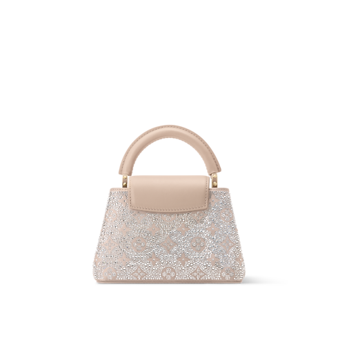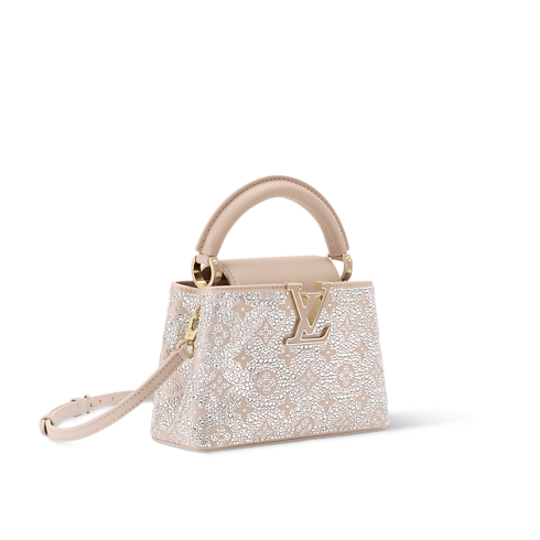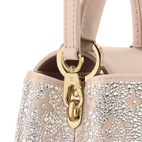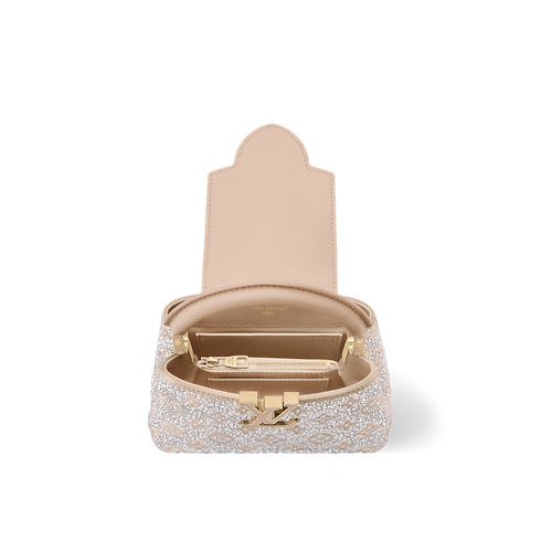 Cette édition scintillante du sac Capucines Mini constitue un choix sophistiqué pour les soirées élégantes. Issu de la collection LV Mirage, ce modèle confectionné en satin est entièrement paré de cristaux Swarovski étincelants. Sa teinte sable s’accorde harmonieusement aux LV Initiales ton sur ton, cerclées de métal doré raffiné. Ce modèle peut être porté à la main, croisé ou à l’épaule.