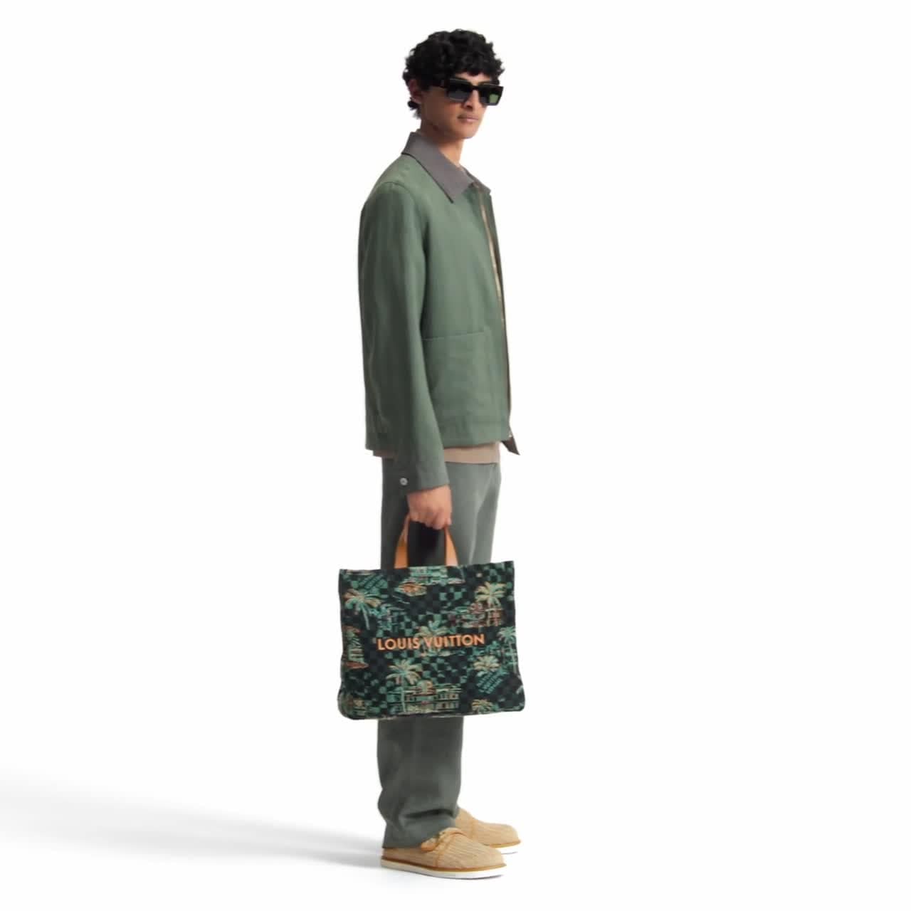 Ce sac Shopper MM en jacquard de coton s'habille d'un motif inspiré des cartes postales rétro de Miami. Évoquant la vie nocturne de la ville, cet imprimé se compose de symboles représentant Miami, tels que des palmiers, des bâtiments emblématiques et une voiture vintage sur un fond bleu Marina. L'ensemble est complété par la signature « Marque déposée L. Vuitton » chère à Pharrell Williams qui est presque cachée dans ce décor somptueux.