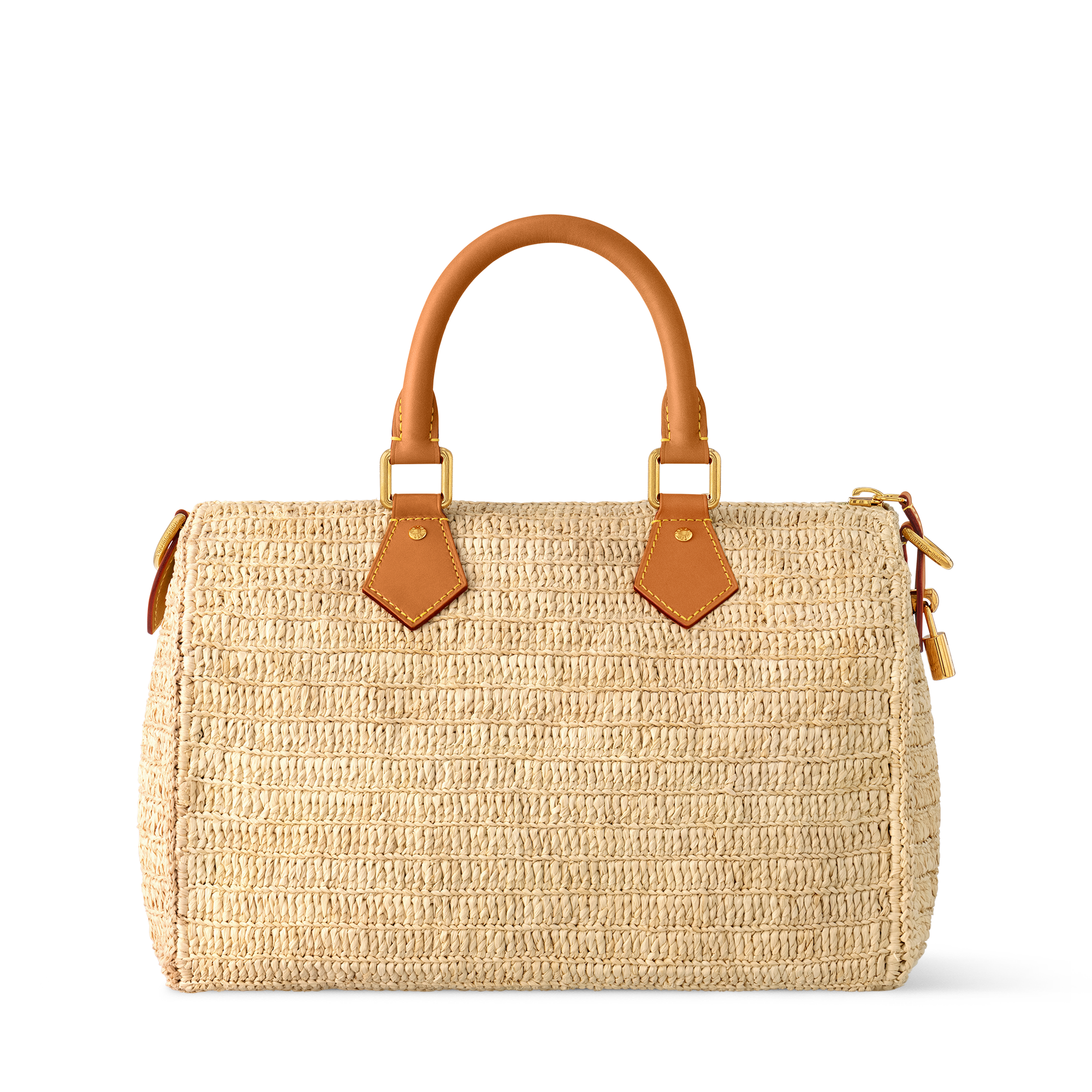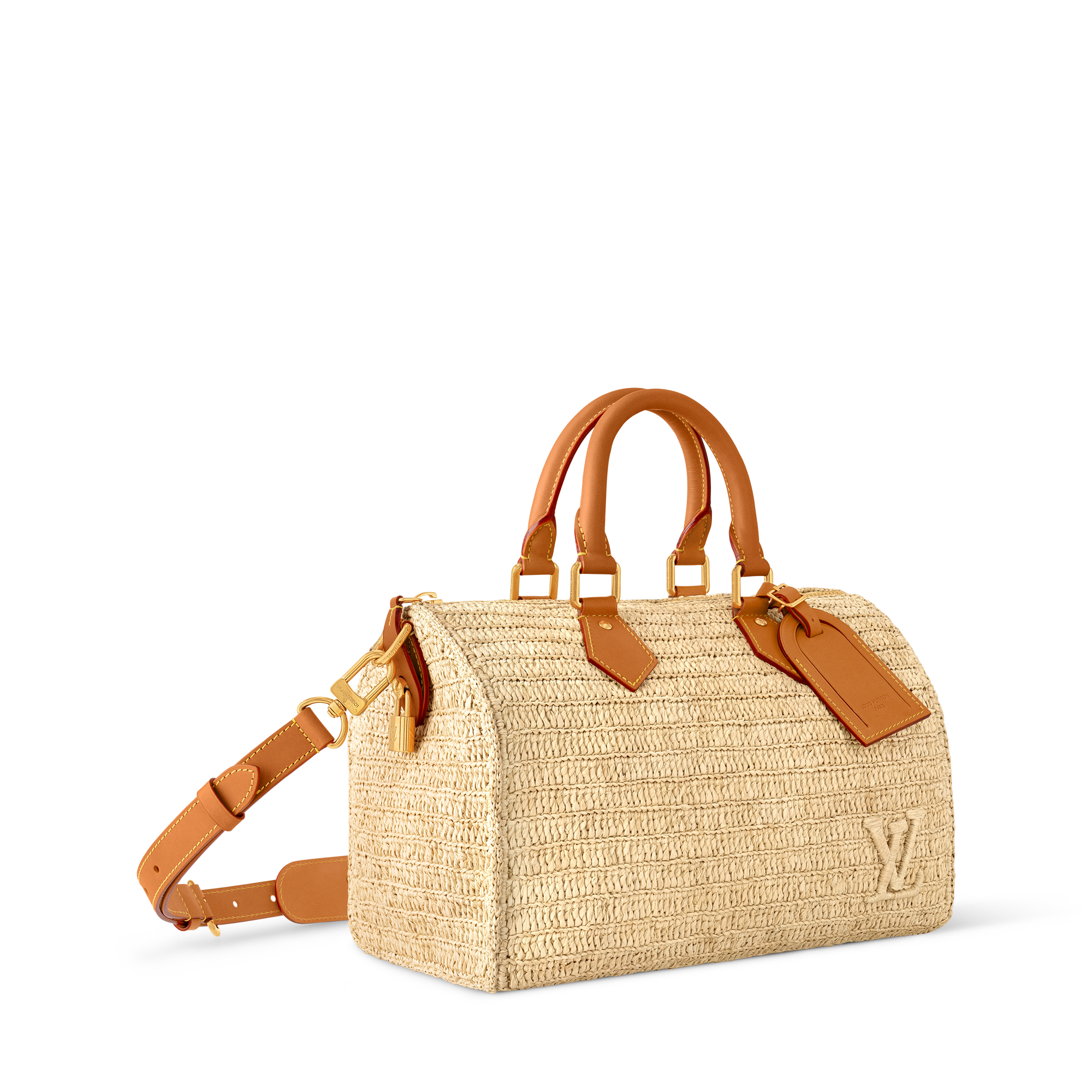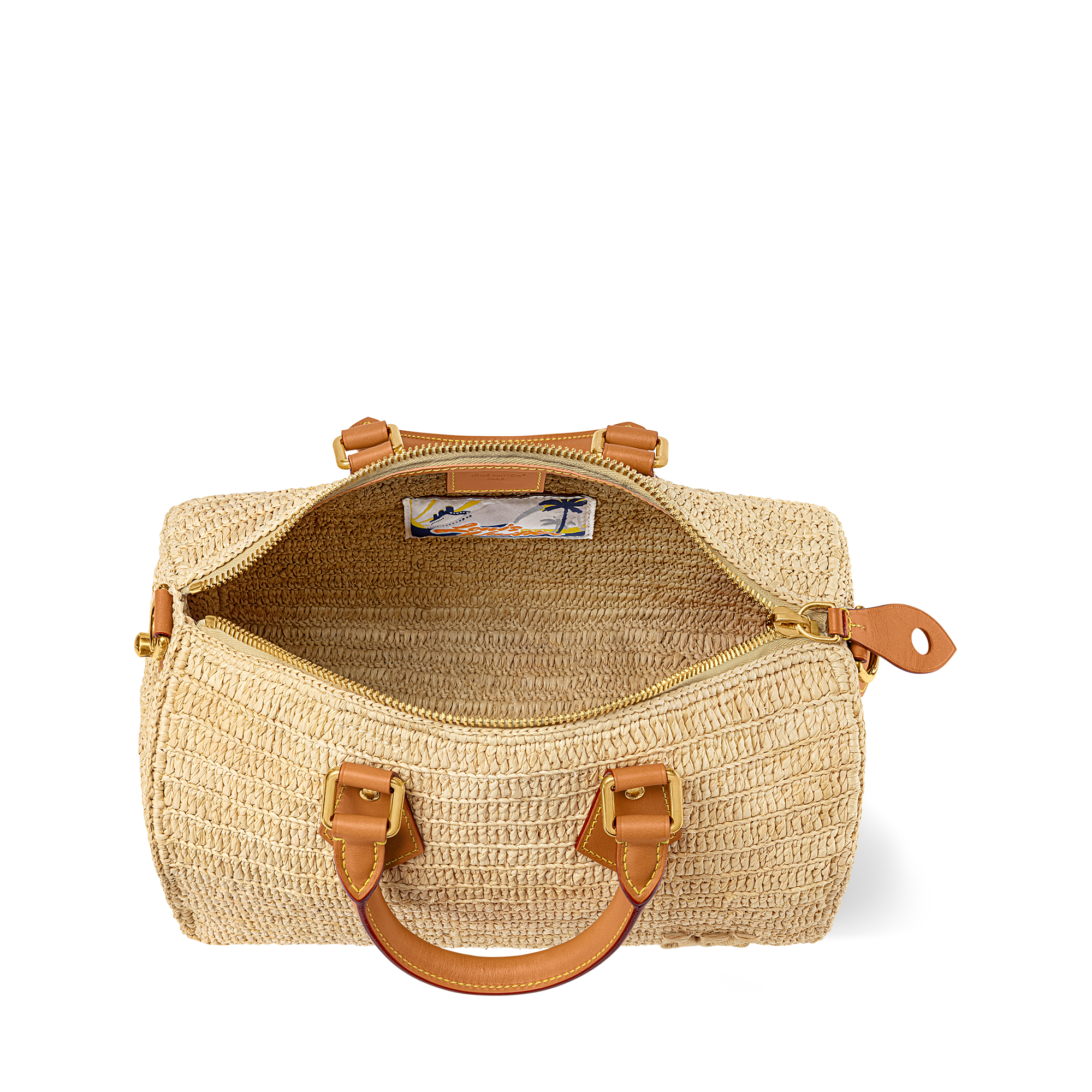 Ce sac Speedy 30 Bandoulière est réalisé en raphia tressé à la main avec une garniture en cuir de vache naturel vieilli à l'esprit vintage. En raison de sa confection artisanale, chaque modèle présente de légères variations qui le rendent unique. Rehaussée des LV Initiales brodées ton sur ton sur le coin avant, cette pièce dispose de deux poignées supérieures et d'une bandoulière amovible et ajustable.