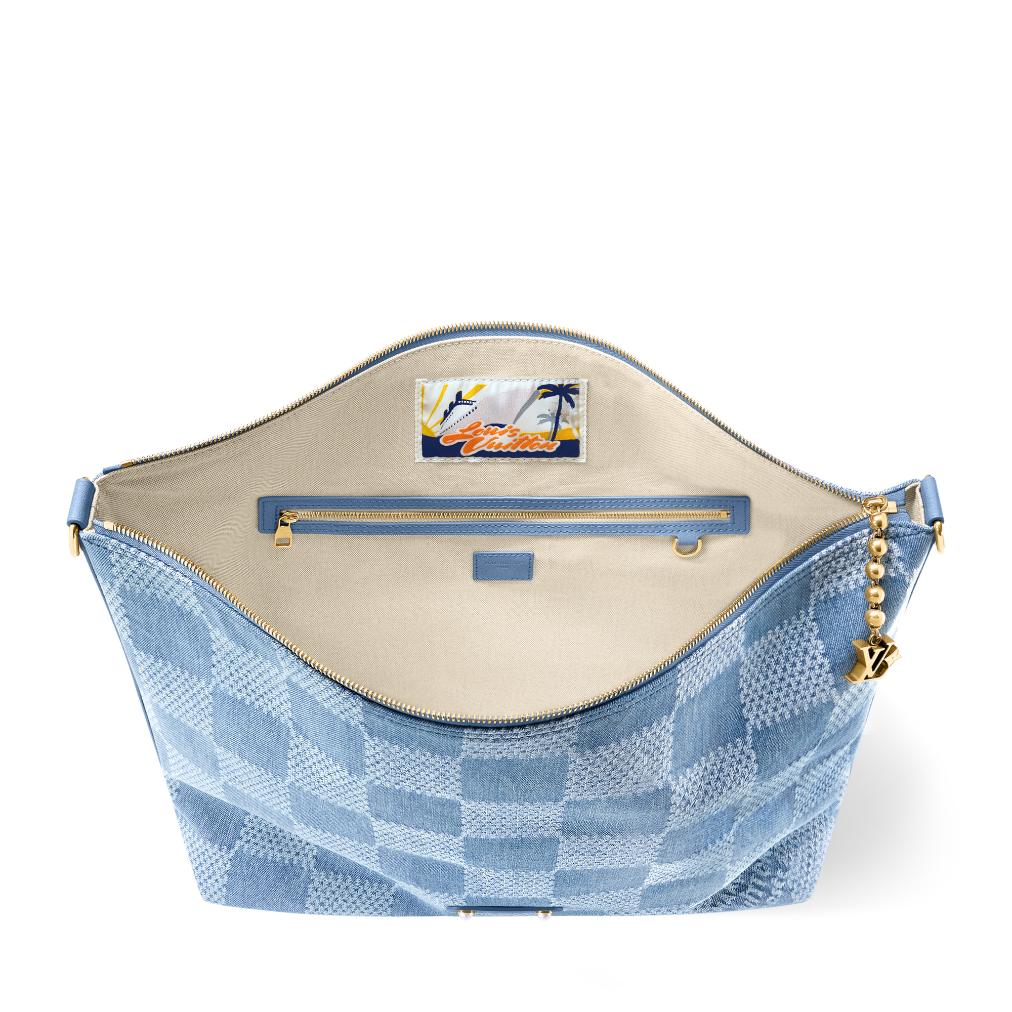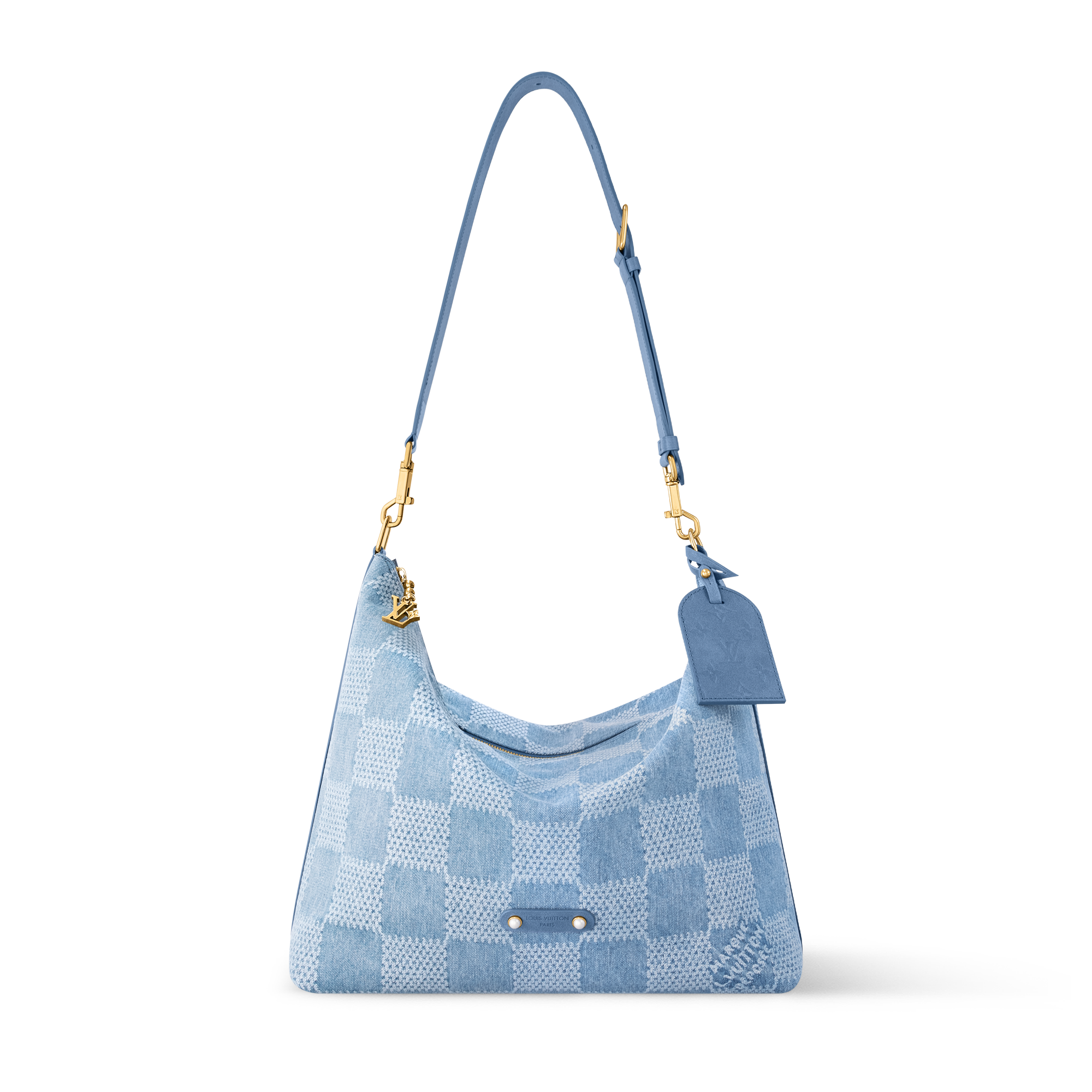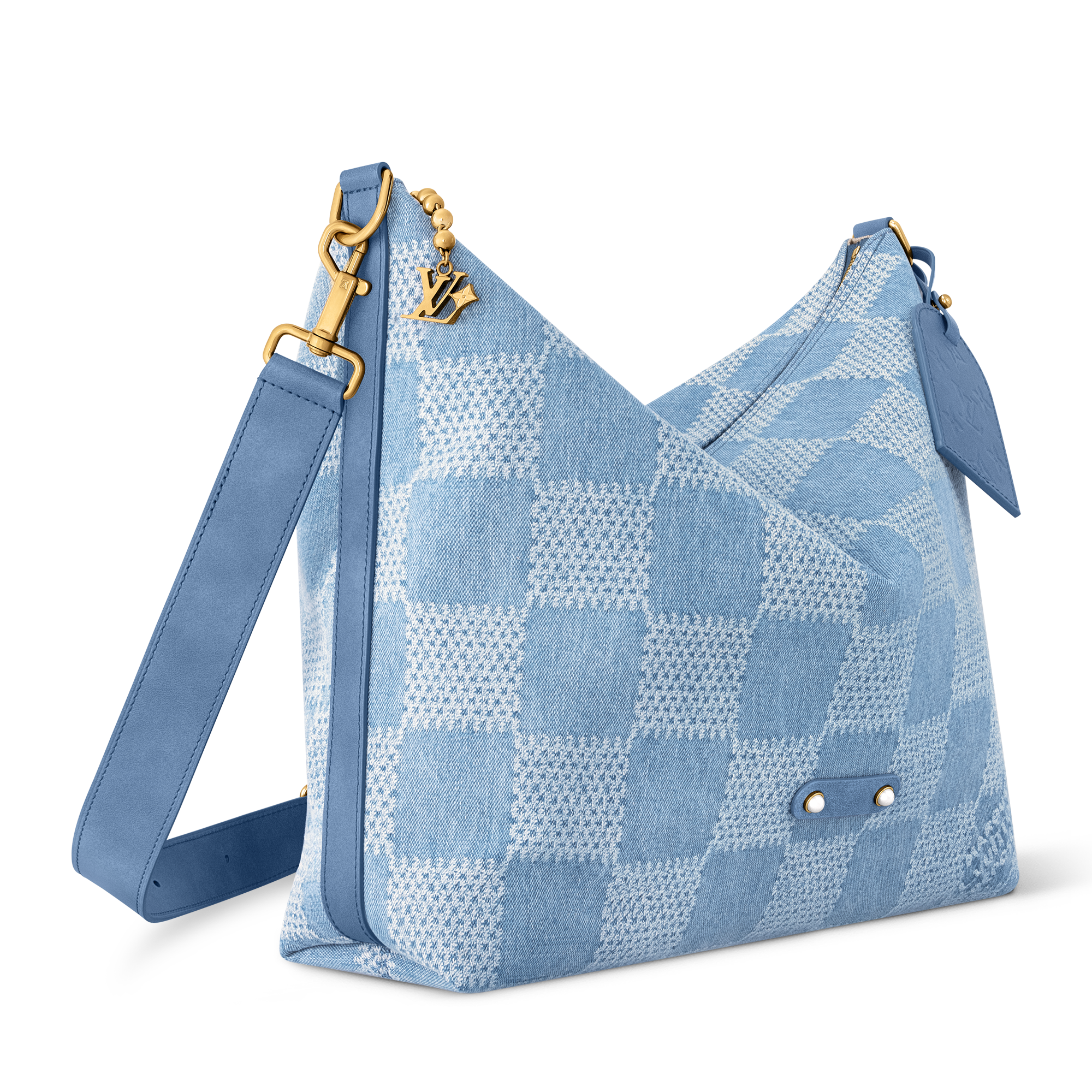 Ce sac Vagabond Hobo en toile de coton Damier Denim 3D se pare d'une garniture en cuir de vache ton sur ton et de finitions dorées. Intemporelle, la doublure en coton est ornée d'une étiquette qui confère à l'intérieur une allure chic et décontractée. Le modèle se pare des détails emblématiques de Pharrell Williams tels que la signature « Marque L. Vuitton Déposée » et la tirette perle métallique.