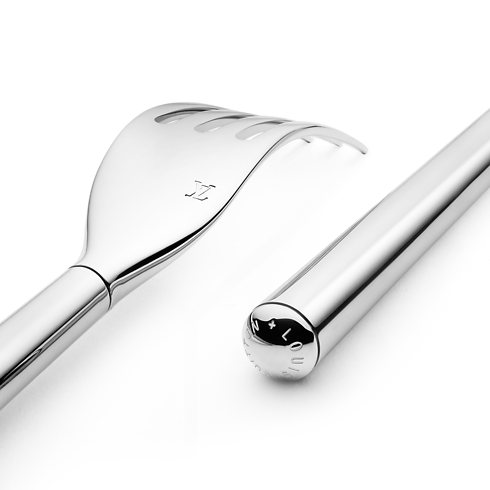Comprenant deux fourchettes, un couteau et deux cuillères à soupe et à café, cet élégant set de couverts à dîner Rivet rend hommage à la tradition malletière de la Maison. Réalisée en acier inoxydable, chaque pièce se caractérise par une extrémité arrondie dont le design rappelle les rivets des malles emblématiques de Louis Vuitton. Raffiné et fonctionnel, ce service dressera une table harmonieuse et esthétique.