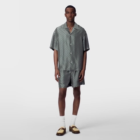 Entièrement habillé d’un motif jacquard LV Fishnet, ce short à taille élastique en soie mélangée fluide reprend le thème nautique de la collection. Les signatures LV vert pâle irisé contrastent sur le fond gris élégant et dessinent une trame graphique. Cette pièce peut s’accompagner d'une chemise à manches courtes pour composer une tenue raffinée pour la journée ou le soir.