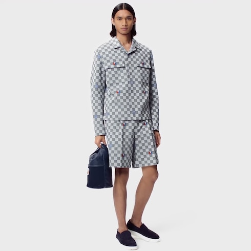 Ce short habillé s'agrémente du motif Damier graphique inspiré de la 37ᵉ America's Cup Louis Vuitton. Il se compose de jacquard de coton en fil coupé sophistiqué dans des tons gris et noirs, souligné par les emblèmes Damier et Gaston colorés. Accompagné de la surchemise assortie, cet incontournable de l'été se décline en un ensemble raffiné.