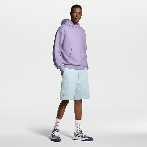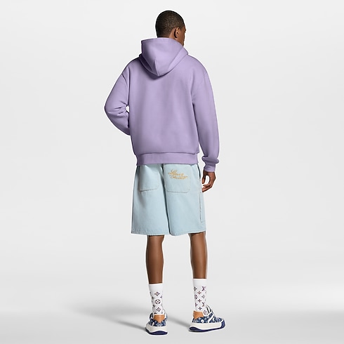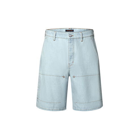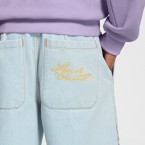 Confectionné en denim biologique dans une teinte pâle indigo délavé, ce short workwear à l'allure estivale illustre le chic décontracté de cette collection. Il est signé d'une broderie Louis Vuitton dorée en écriture manuscrite sur une poche arrière, tandis que des rivets fleur de Monogram ornent le devant. Ce modèle est rehaussé de surpiqûres couleur tabac et d'une fermeture à bouton nacré raffiné. Un blouson assorti permet de composer un ensemble de saison.