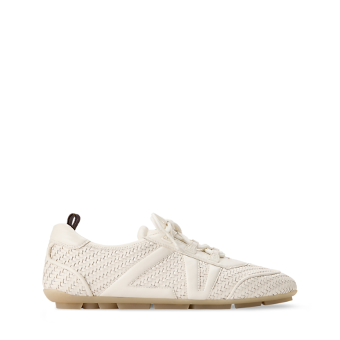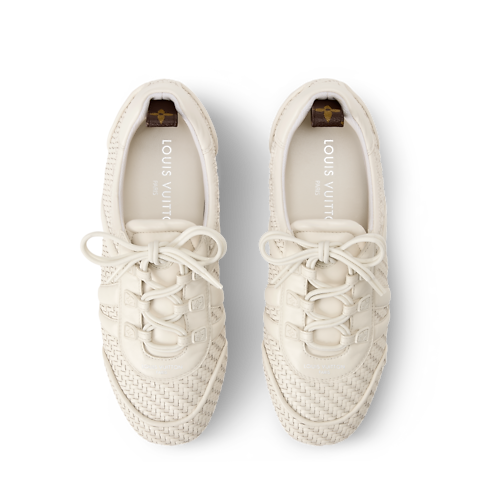 À l'occasion du défilé Louis Vuitton Printemps-Été 2026, le directeur artistique des collections Femme, Nicolas Ghesquière, a revisité cette sneaker LV Sneakerina afin de rendre hommage au savoir-faire d'exception de la Maison. Cette version se décline dans un cuir d’agneau méticuleusement tressé et se rehausse des initiales LV habillées de cuir sur le côté. Elle est sublimée par une semelle extérieure en gomme et une boucle au talon en toile Monogram.