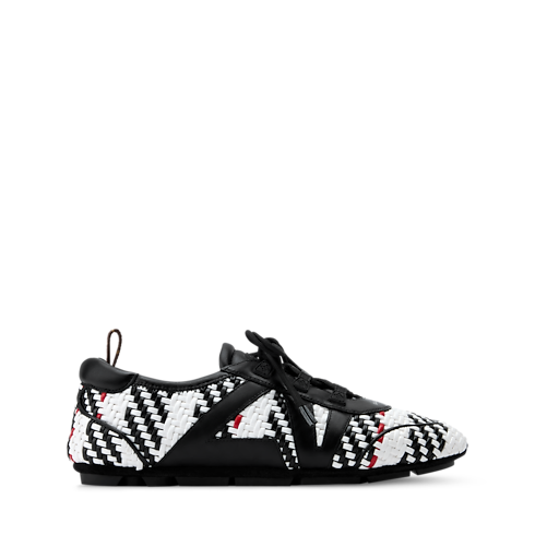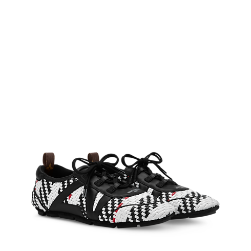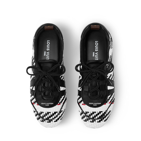 À l'occasion du défilé Louis Vuitton Printemps-Été 2026, le directeur artistique des collections Femme, Nicolas Ghesquière, a revisité cette sneaker LV Sneakerina afin de rendre hommage au savoir-faire d'exception de la Maison. Cette version se décline dans un cuir d’agneau méticuleusement tressé et se rehausse des initiales LV habillées de cuir sur le côté. Elle est sublimée par une semelle extérieure en gomme et une boucle au talon en toile Monogram.