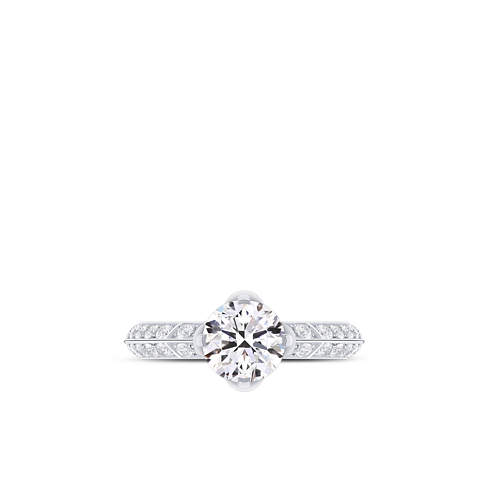 Au centre de cette superbe bague LV Diamonds se trouve un diamant taille brillant niché dans une monture en forme de fleur de Monogram. Il est entouré d'un anneau en platine en forme de V serti d'un pavage de diamants scintillant. Sous la pierre centrale, une ouverture raffinée en forme de fleur de Monogram lui confère un accent emblématique. Cette pièce s'accompagne d'un certificat LV Diamonds, un document numérique unique et immuable qui précise les caractéristiques du diamant central et l'ensemble de son parcours, de l'extraction au sertissage final. Ce certificat sécurisé bénéficie de la technologie du consortium Aura Blockchain. Ce bijou peut être personnalisé pour offrir un souvenir unique.