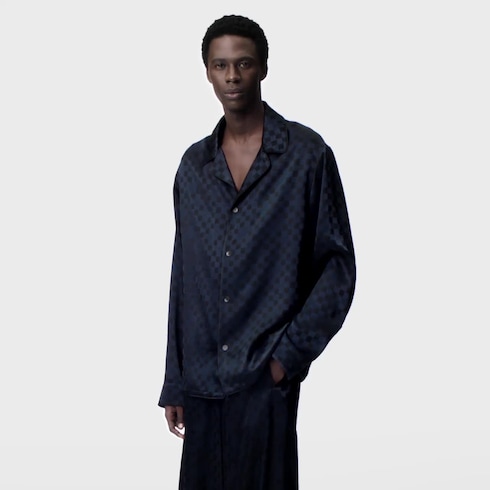 Compagne idéale des tenues de soirée, cette chemise fluide façon pyjama allie décontraction et élégance. Conçue dans un jacquard de soie mélangée texturé, elle est habillée d’un motif Wavy Damier discrètement orné de détails Monogram, revisitant le motif historique de la Maison. Cette pièce peut être portée avec le pantalon à taille élastique assorti pour créer un ensemble sophistiqué.