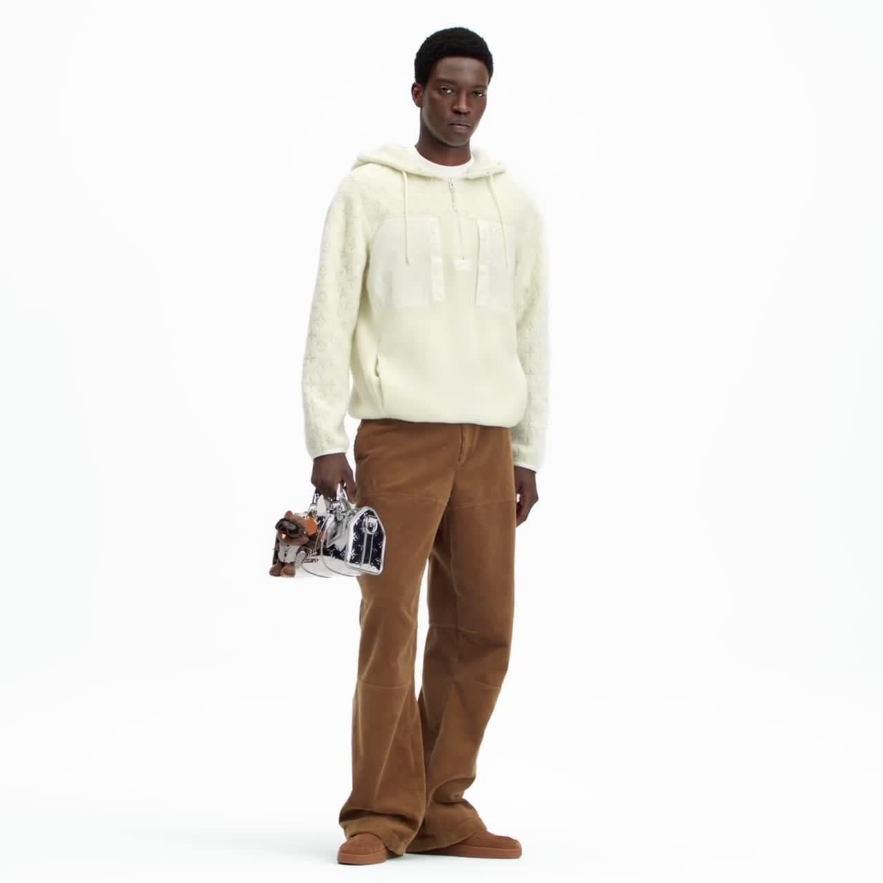 Inspiré par les randonnées en montagne, ce sweat à capuche blanc est à la fois un vêtement technique adapté au plein air et une pièce élégante pour rehausser les tenues du quotidien. Sa matière en laine bouclée somptueuse s’agrémente d’un jacquard Monogram texturé sur l’empiècement et les manches. Les poches en nylon plaquées et zippées, dont l’une s’orne d’une signature Vuitton brodée en lettres cursives, ajoutent une note sportive.
