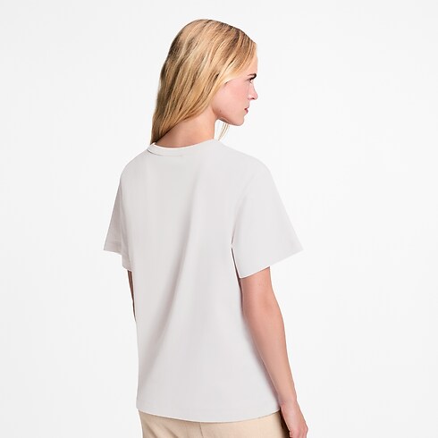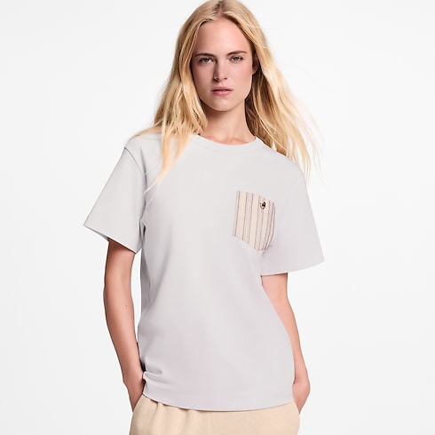 Réalisé en jersey de coton doux, ce tee-shirt intemporel adopte une coupe droite et s’agrémente d’un col rond côtelé. La poitrine se pare d’une poche plaquée à motif rayé coloré, tandis qu’un bouton bijou brillant vient compléter l’ensemble d’une note de fantaisie raffinée.