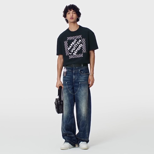 Ce tee-shirt noir en coton est orné de la signature « Marque L. Vuitton déposée », inspirée des archives et présentée par Pharrell Williams lors du défilé Printemps-Été 2024. Les broderies alliant fils et perles évoquent les thèmes d'inspiration dandy de la collection. Ce modèle chic et décontracté comporte une étiquette à effet inversé brodée en perles au dos.