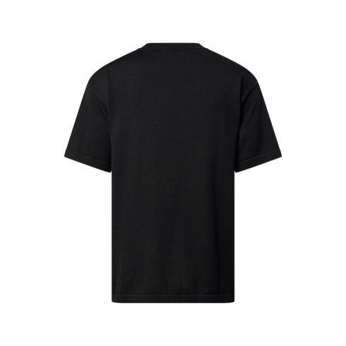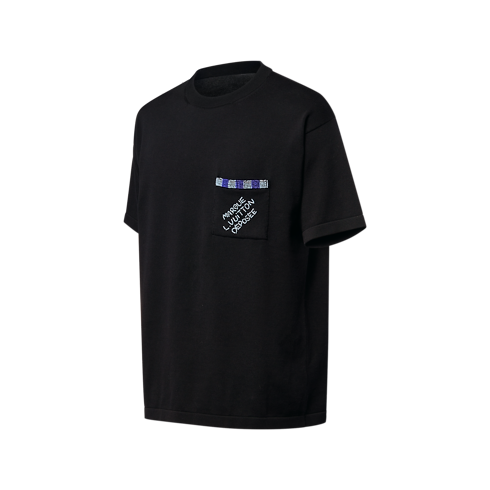 Ce tee-shirt noir élégant présente un col rond, des manches courtes et une poche plaquée sur la poitrine. Cette dernière est rehaussée d’une bordure Damier formée de perles brodées dans des tons bleus contrastés et d'une signature « Marque L. Vuitton Déposée », qui ajoutent une note distinguée aux tenues décontractées du quotidien.