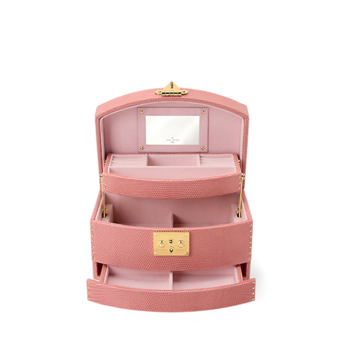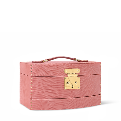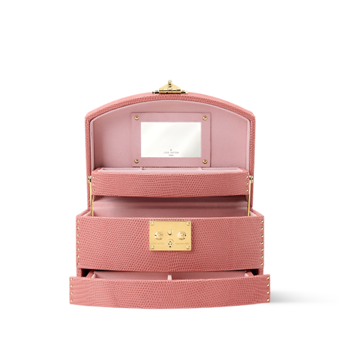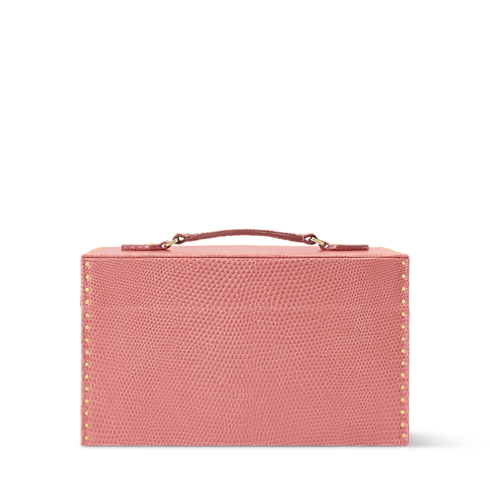 Inspiré des somptueux boudoirs d’Anne d’Autriche, ce Vanity Chéri est confectionné en cuir de lézard précieux et orné de rivets discrets sur les côtés. Il se décline dans une teinte saumon douce avec une doublure assortie. Son système coulissant permet d’ouvrir simultanément les trois tiroirs, offrant un accès immédiat au contenu. Spacieux tout en restant léger, il se porte aisément grâce à son format compact et sa poignée supérieure.