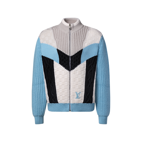 Cette veste de jogging color-block de couleur vive revisite un classique de la Maison dans une maille épaisse. Idéale pour les soirées fraîches du printemps, elle se distingue par des empiècements sportifs en intarsia réalisés à la main en utilisant différents types de points, notamment un motif Damier texturé sur la partie principale. Une signature LV brodée en bas à gauche de cette pièce remarquable apporte une note audacieuse aux looks décontractés.
