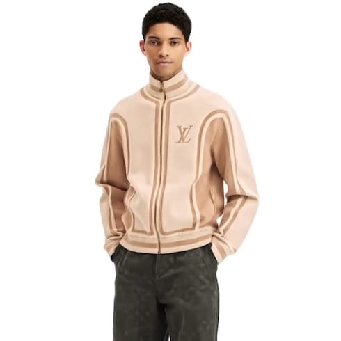À la fois décontracté et élégant, ce haut de survêtement zippé en maille se prête à des instants de détente. Le motif bicolore présente des bandes intarsia sportives sur le corps et les manches, reprises sur le col, les poignets et l’ourlet côtelés. Un LV en intarsia sublime la poitrine, tandis qu’une signature Vuitton orne le dos. Les différentes teintes sont mises en valeur par des jeux de points variés, créant un subtil effet de relief.