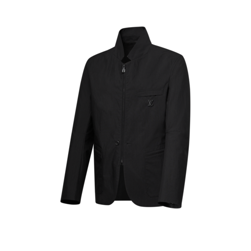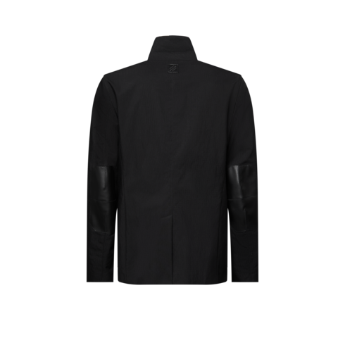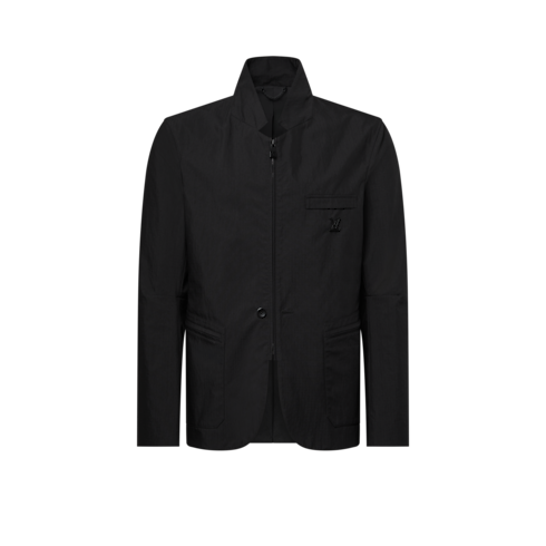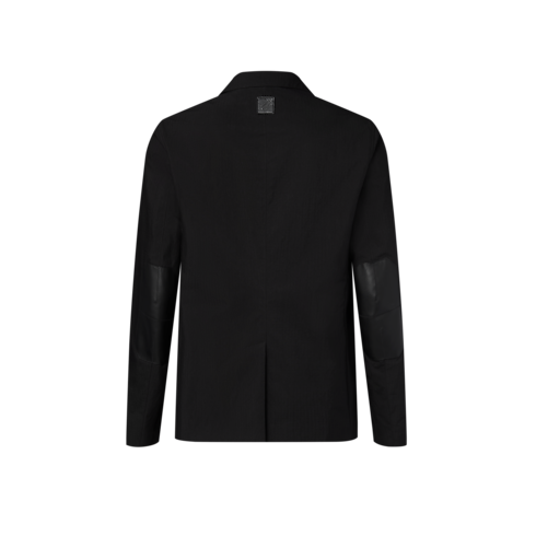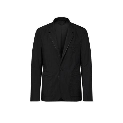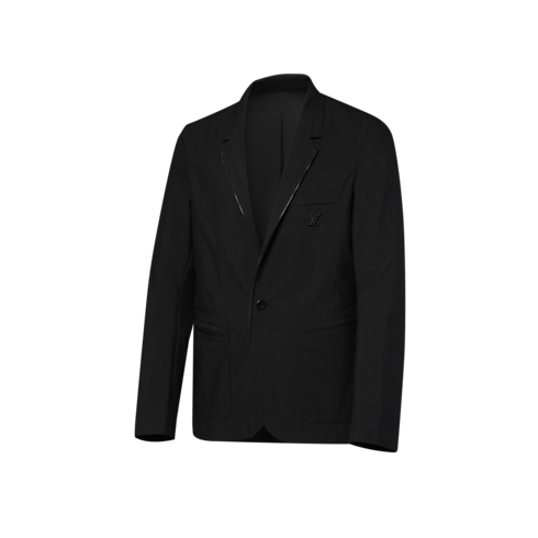 Cette veste droite noire présente une silhouette élégante avec des détails d'inspiration utilitaire. Confectionnée en coton ripstop technique et non doublée pour rester légère en été, elle se distingue par des revers crantés zippés et des patchs noirs aux coudes. La poche de poitrine est agrémentée d’un ornement LV, tandis qu’un patch en cuir noir « Marque L. Vuitton Déposée » signe le dos. Cette pièce peut s'associer au pantalon cargo assorti pour composer un look citadin entièrement noir.