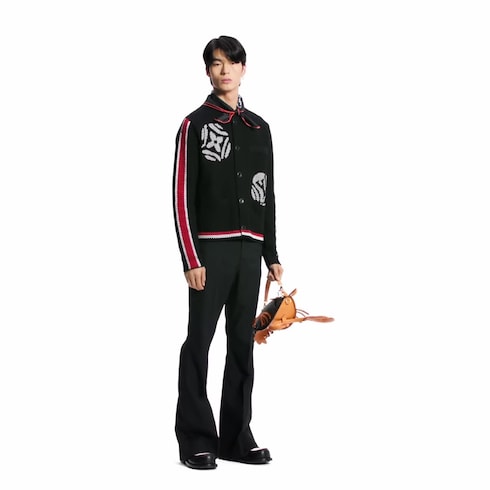 Aperçue lors du défilé Automne-Hiver 2025, cette veste noire en maille de coton cultive un style preppy avec ses rayures graphiques rouges et blanches sur les manches et la taille. L’élégante coupe sans col, légère et texturée, se rehausse d’un motif LV Polka Dots oversize où s'invitent les signatures de la Maison en intarsia blanc. Ce modèle se porte tel un cardigan ou comme une veste estivale légère.