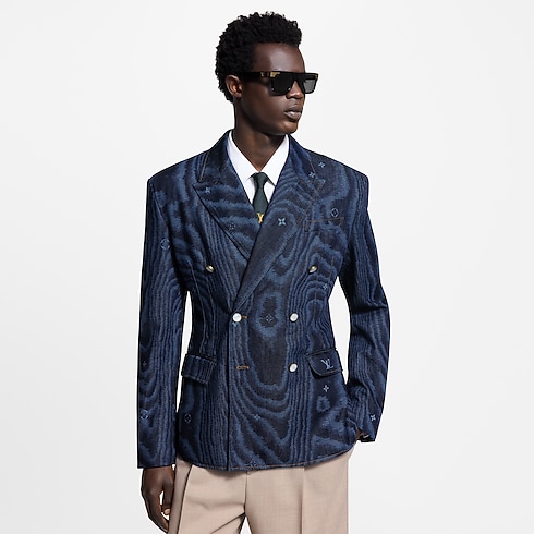 Dotée d’épaules anguleuses et d'une taille ajustée, cette veste habillée croisée en denim revisite le costume traditionnel dans un esprit contemporain. Le motif LV Moiré ludique de la collection donne l’illusion d'une confection en soie chatoyante. Des boutons effet perle élégants subliment la fermeture et les poignets, tandis qu’une étiquette emblématique en nubuck orne le dos. Un pantalon assorti complète cette tenue exceptionnelle.
