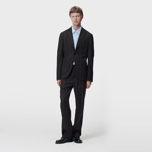 Inspirée du style décontracté caractéristique du tailoring italien, cette veste Napolitana légèrement structurée et non doublée est particulièrement agréable à porter. Sa matière en laine de costume ton sur ton est sublimée par un jacquard Monogram Stripes parsemé de signatures LV et de fleurs de Monogram discrètes. Le motif à rayures classique allonge la silhouette pour créer une coupe flatteuse, dont l'effet est accentué par le pantalon ajustable assorti qui permet de composer un look naturellement chic.