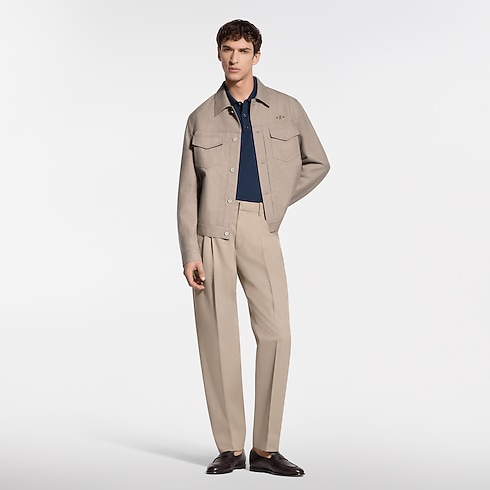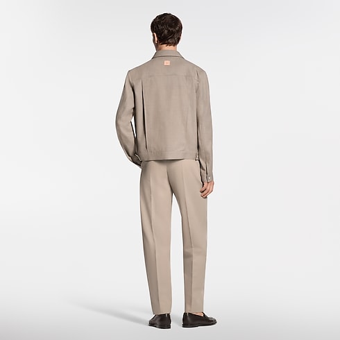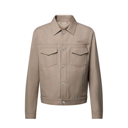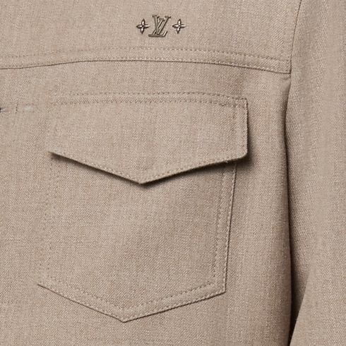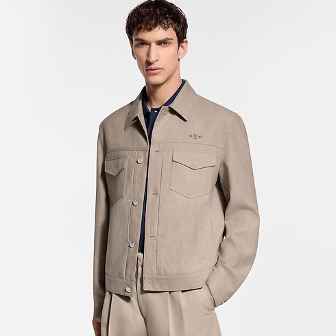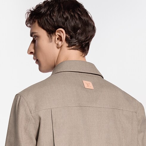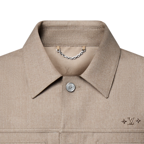 Confectionnée en twill de laine et de soie beige intemporel, elle se pare de boutons effet nacre et d'ornements emblématiques sur la poitrine, tandis qu’un patch LV en cuir vient signer le dos. D’une élégance naturelle, elle constitue la pièce légère idéale pour les journées plus douces.