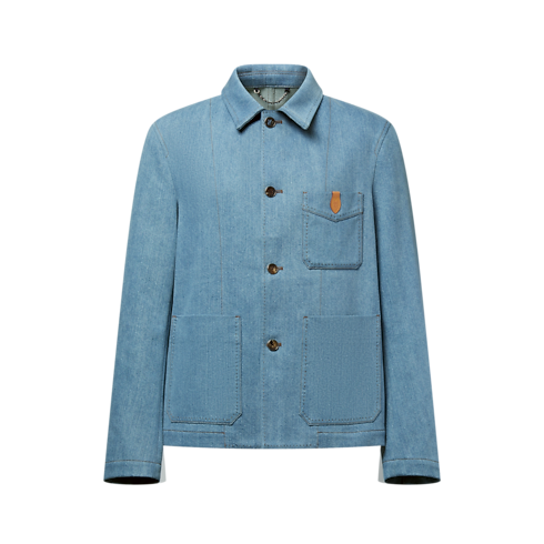 Le denim se voit revisité avec cette veste workwear sobre et raffinée confectionnée en twill de coton et de soie issu des plus prestigieuses filatures japonaises. Sa silhouette souplement structurée est rehaussée de points droits et d'une languette emblématique en cuir naturel sur la poche poitrine, tandis qu’une couture LV signe le bouton du haut. Son coloris indigo pâle délavé lui prête un esprit printanier. Associée à un pantalon assorti, elle compose un ensemble dans l'air du temps.