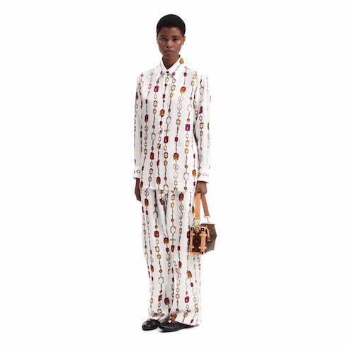 Kemeja bergaya klasik ini terlihat elegan dalam nuansa warna serta motif khas musim ini di seluruh permukaannya, yang berbentuk kalung dengan elemen ikonis Rumah mode dan rangkaian batu mulia. Desainnya yang berbahan silk twill ringan hadir dalam potongan lurus, dilengkapi smart collar dan pergelangan tangan berkancing. Sementara model kancing yang kontras memberi sentuhan memikat pada tampilannya.