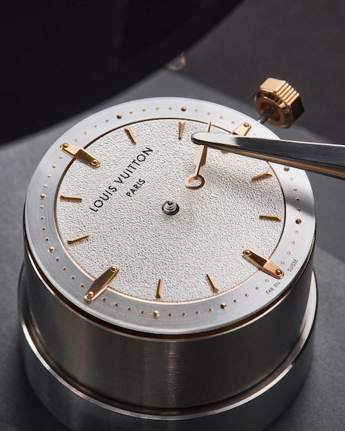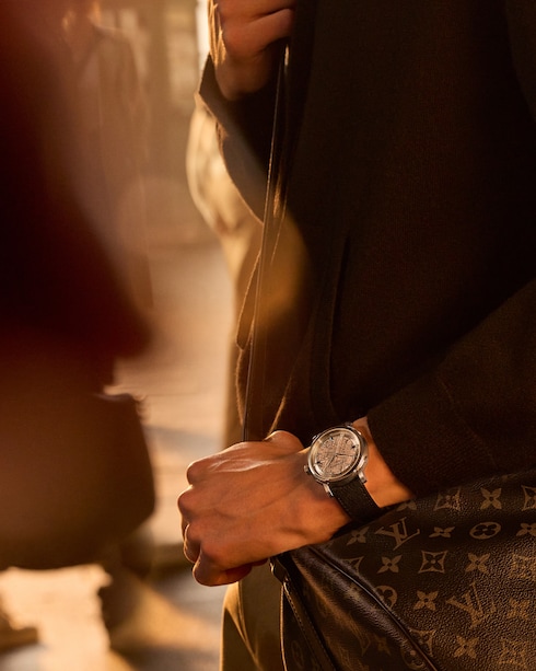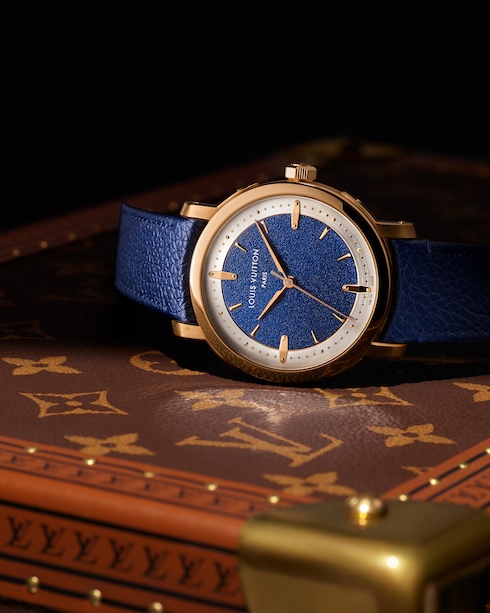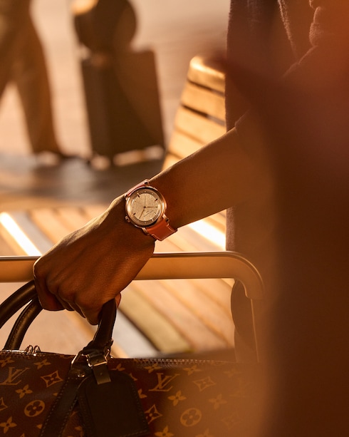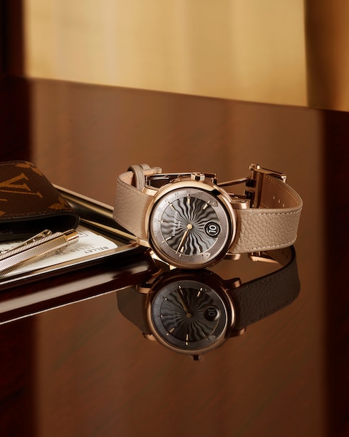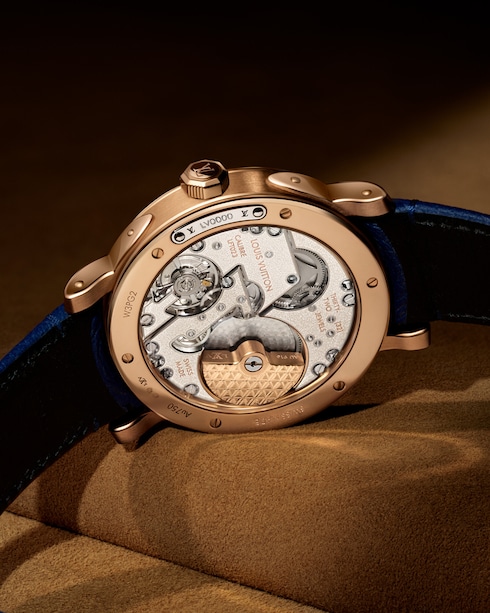 Jam tangan ini kaya akan kompleksitas, pada dial jam memperlihatkan indeks dan gold stud yang terinspirasi oleh aksen metalik dan lozine nail pada trunk ikonik dari Louis Vuitton, sementara ukiran pada bagian sentral menambahkan tekstur visual kepada pilihan variasi rose gold – yang merupakan sebuah ode kepada Monogram canvas ikonik milik Rumah Mode.